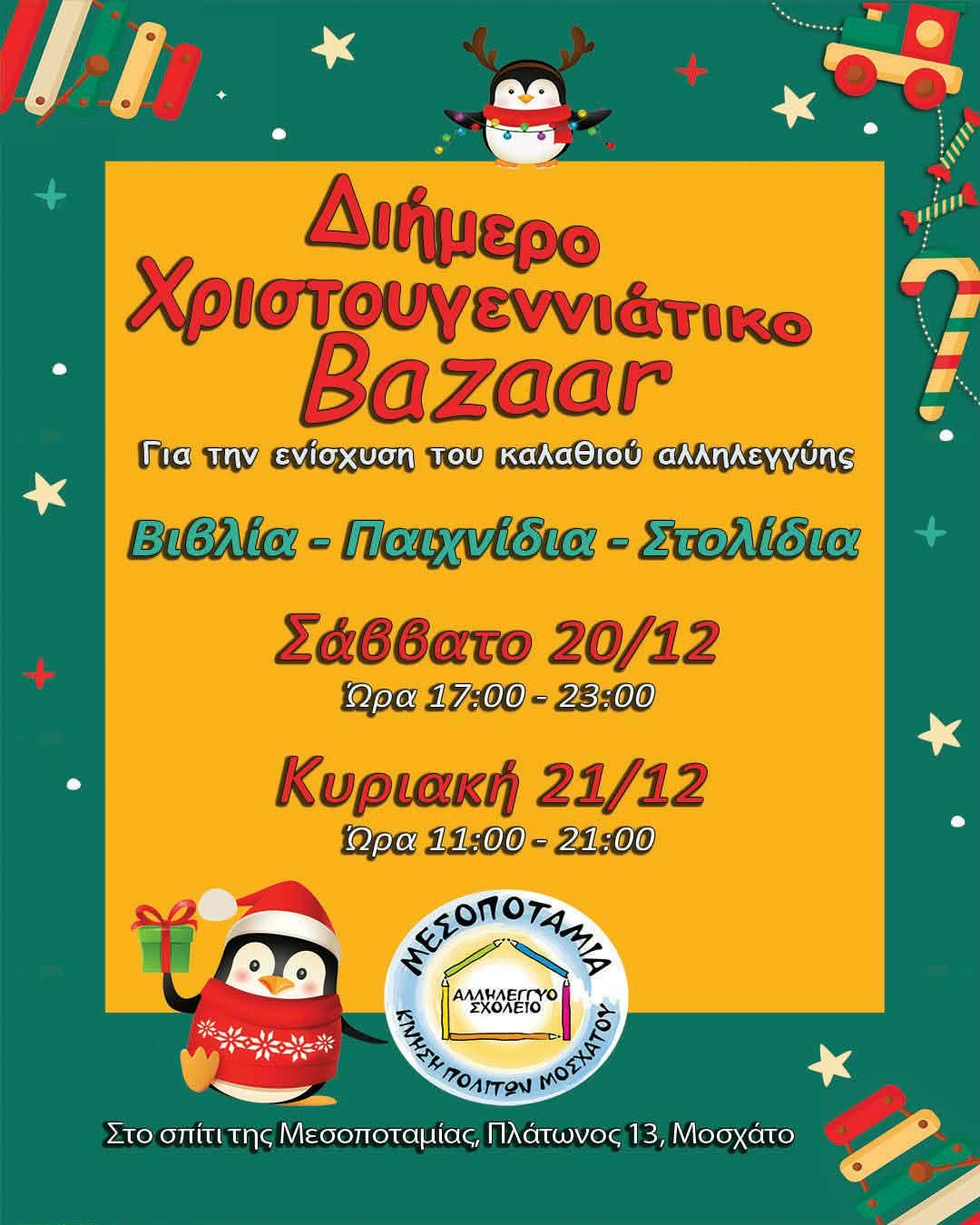 Tο Σαββατοκύριακο, 20 & 21 Δεκεμβρίου, το Αλληλέγγυο Σχολείο Μεσοποταμίας διοργανώνει διήμερο γιορτινό bazaar!