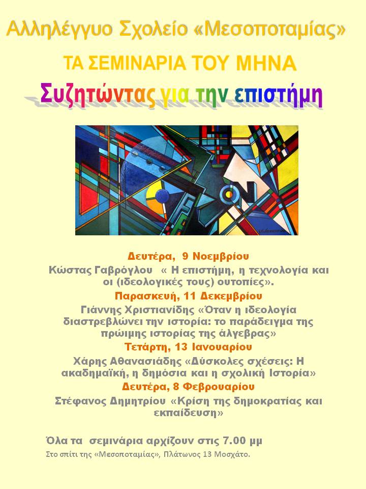 Τα αλληλέγγυα σχολεία είναι πια μια πραγματικότητα. Σε δεκάδες γειτονιές της Αθήνας και του Πειραιά, στην Θεσσαλονίκη, στις μεγάλες πόλεις της περιφέρειας, στα χωριά και στα νησιά, παντού, οι εκπαιδευτικοί οργανώνονται εθελοντικά για να βοηθήσουν τα παιδιά να καλύψουν τις ανάγκες τους στη γνώση. Τα αλληλέγγυα σχολεία δεν λειτουργούν και δεν πρέπει να λειτουργούν ως εναλλακτικά των φροντιστηρίων. Θέλουν να αποτελέσουν τη βάση μιας εναλλακτικής εκπαιδευτικής πρότασης, να πάνε παραπέρα την εκπαίδευση δημιουργώντας νέα εναλλακτικά μοντέλα. Γι’ αυτό φέτος, εμείς στο Αλληλέγγυο Σχολείο της «Μεσοποταμίας» προχωρούμε στην προσπάθεια της διοργάνωσης μιας σειράς επιμορφωτικών σεμιναρίων για τους εκπαιδευτικούς και τους ενήλικους φίλους μας, σεμινάρια ανοιχτά σε όποιον θέλει και ενδιαφέρεται να τα παρακολουθήσει, γιατί τα αλληλέγγυα σχολεία είναι κέντρο δραστηριοτήτων για όλη την γειτονιά, για όλη την περιοχή τους. Τα λέμε «Τα σεμινάρια του μήνα» και θα πραγματοποιούνται μια φορά το μήνα στο «Σπίτι της Μεσοποταμίας».