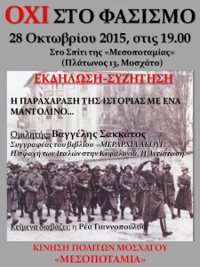 Λέμε ΟΧΙ στον Φασισμό 28 Οκτωβρίου 2015 στις 19.00 στο σπίτι της Μεσοποταμίας, Πλάτωνος 13 Μοσχάτο ΕΚΔΗΛΩΣΗ – ΣΥΖΉΤΗΣΗ Η παραχάραξη της ιστορίας με ένα μαντολίνο… Ομιλητής Βαγγέλης Σακκάτος, συγγραφέας […]