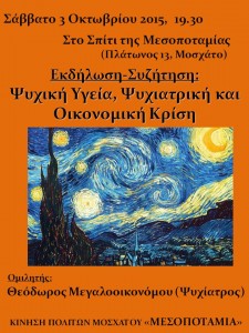 Η Κίνηση Πολιτών Μοσχάτου Μεσοποταμία σας προσκαλεί στην εκδήλωση – συζήτηση με τίτλο: Ψυχική Υγεία, Ψυχιατρική και Οικονομική Κρίση Εισηγητής : Θοδωρής Μεγαλοοικονόμου, Ψυχίατρος Στο σπίτι της Μεσοποταμίας, (Πλάτωνος 13 […]