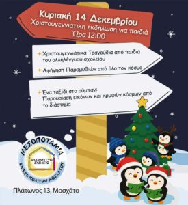 Tο Σαββατοκύριακο, 20 & 21 Δεκεμβρίου, το Αλληλέγγυο Σχολείο Μεσοποταμίας διοργανώνει διήμερο γιορτινό bazaar! Βιβλία, παιχνίδια, στολίδια και άλλα χειροποίητα είδη σας περιμένουν, ενώ μπορείτε να στηρίξετε το Καλάθι Αλληλεγγύης […]
