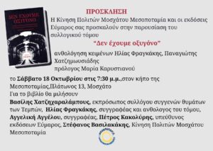 📚 Παρουσίαση βιβλίου: «Δεν έχουμε οξυγόνο» Η Κίνηση Πολιτών Μοσχάτου Μεσοποταμία και οι εκδόσεις Εύμαρος σας προσκαλούν στην παρουσίαση του συλλογικού τόμου «Δεν έχουμε οξυγόνο» (ανθολόγηση κειμένων: Ηλίας Φραγκάκης, Παναγιώτης […]