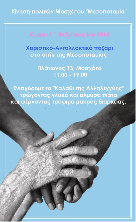 Την Κυριακή 1 Φεβρουαρίου 2015 η Μεσοποταμία διοργανώνει Χαριστικό-Ανταλλακτικό παζάρι στο σπίτι της Πλάτωνος 13 από τις 11.00 το πρωί έως το απόγευμα στις 7.00.