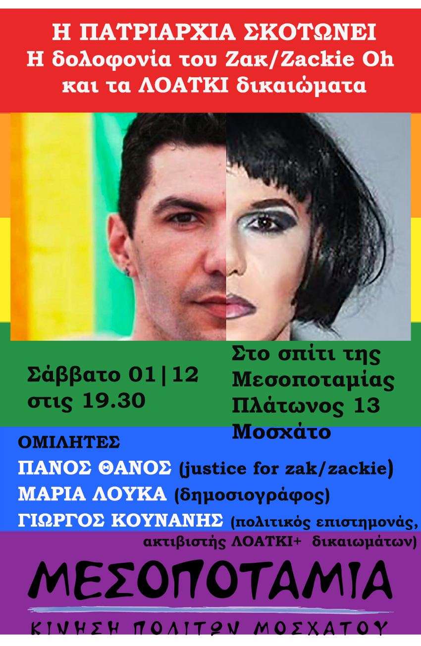 Η Κίνηση Πολιτών Μοσχάτου Μεσοποταμία διοργανώνει εκδήλωση-συζήτηση με θέμα: «Η πατριαρχία σκοτώνει – Η δολοφονία του Ζακ/Zackie Oh και τα ΛΟΑΤΚΙ+ δικαιώματα» , το Σάββατο 1/12/2018, στις 19.30, στο Σπίτι της Μεσοποταμίας, Πλάτωνος 13, Μοσχάτο.