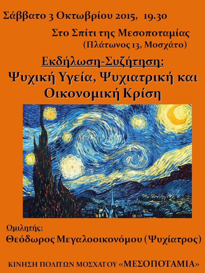 Στο σπίτι της Μεσοποταμίας, (Πλάτωνος 13 Μοσχάτο), το Σάββατο 3 Οκτωβρίου στις 7.30 μ.μ. θα γίνει αναφορά και συζήτηση για τις επιπτώσεις της οικονομικής κρίσης στη λειτουργεία των νοσοκομείων και των ιδρυμάτων που υπηρετούν την ψυχική υγεία και θα μιλήσουμε για τις συνέπειες της κρίσης στην ψυχική υγεία μας, αλλά και των ανθρώπων γύρω μας.