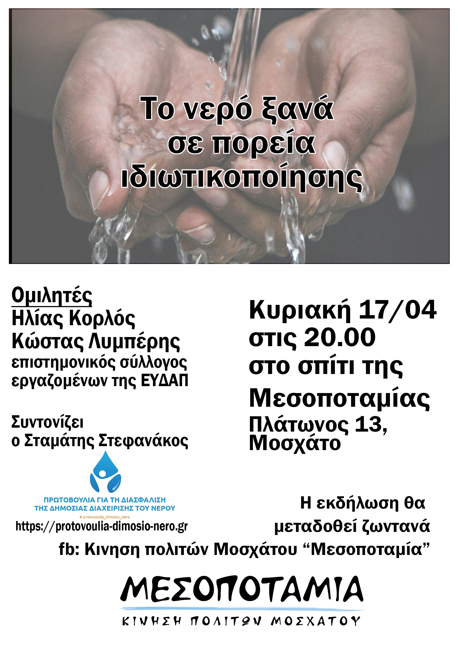 Η Κίνηση Πολιτών Μοσχάτου «Μεσοποταμία» με τη συμμετοχή μελών της «Πρωτοβουλίας για την διασφάλιση της δημόσιας διαχείρισης του νερού» διοργανώνει, ενημερωτική εκδήλωση την Κυριακή 17/04/2022 στις 20:00 στο σπίτι της Μεσοποταμίας (Πλάτωνος 13 – Μοσχάτο) που περιλαμβάνει τα παρακάτω θέματα: