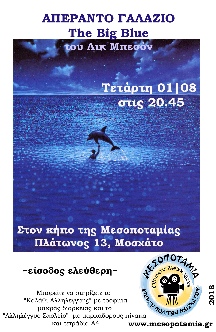 Πρώτη προβολή για τον μήνα Αύγουστο, που θα πραγματοποιηθεί την Τετάρτη 1 Αυγούστου στις 20.45 στον κήπο της Μεσοποταμίας (Πλάτωνος 13, Μοσχάτο) είναι η ταινία «Απέραντο Γαλάζιο» (The big blue) του Λικ Μπεσόν.