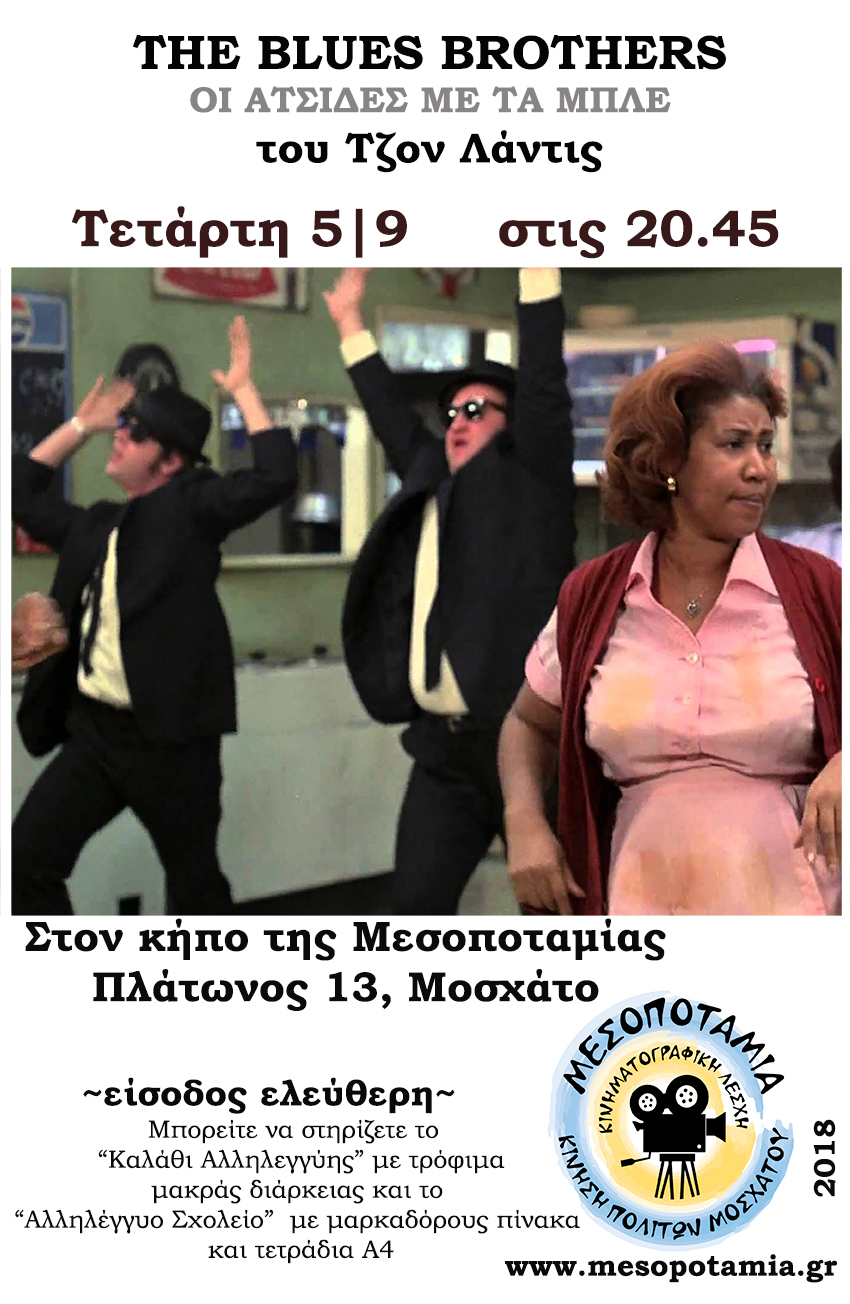 Η πρώτη μας προβολή για το Σεπτέμβριο θα λάβει χώρα αυτή την Τετάρτη, 5/9, με την κλασσική κωμωδία «The Blues Brothers» (Ελλ. τίτλος «Οι Ατσίδες με τα μπλε», 1980, Έγχρ., 133΄), του Τζον Λάντις, με τους Νταν Ακρόιντ, Τζον Μπελούσι, Αρίθα Φράνκλιν, Τζέιμς Μπράουν, Ρέι Τσαρλς, Καμπ Κόλογουεϊ και άλλους.