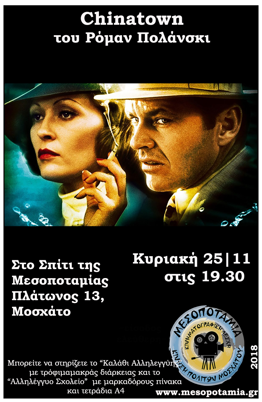 Η επόμενη προβολή μας θα λάβει χώρα την Κυριακή, 25/11, με την κλασσική ταινία «Τσάιναταουν» του Ρομάν Πολάνσκι (1974, Έγχρωμο, 130΄), με τους Τζακ Νίκολσον, Φέι Ντάναγουεϊ, Τζον Χιούστον.