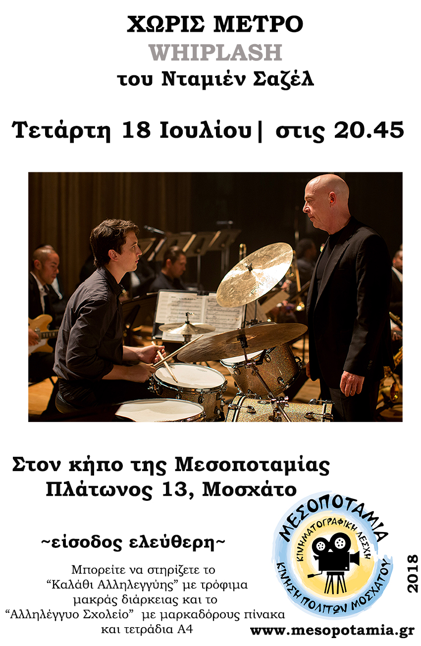 Η επόμενη προβολή μας θα λάβει χώρα την Τετάρτη, 18/7, με τη βραβευμένη ταινία «Whiplash» (Ελλ. τίτλος «Χωρίς Μέτρο», 2014, Έγχρωμο, 107΄), του Ντέιμιεν Σαζέλ, με τους Μάιλς Τέλλερ και Τζ. Κ. Σίμμονς.