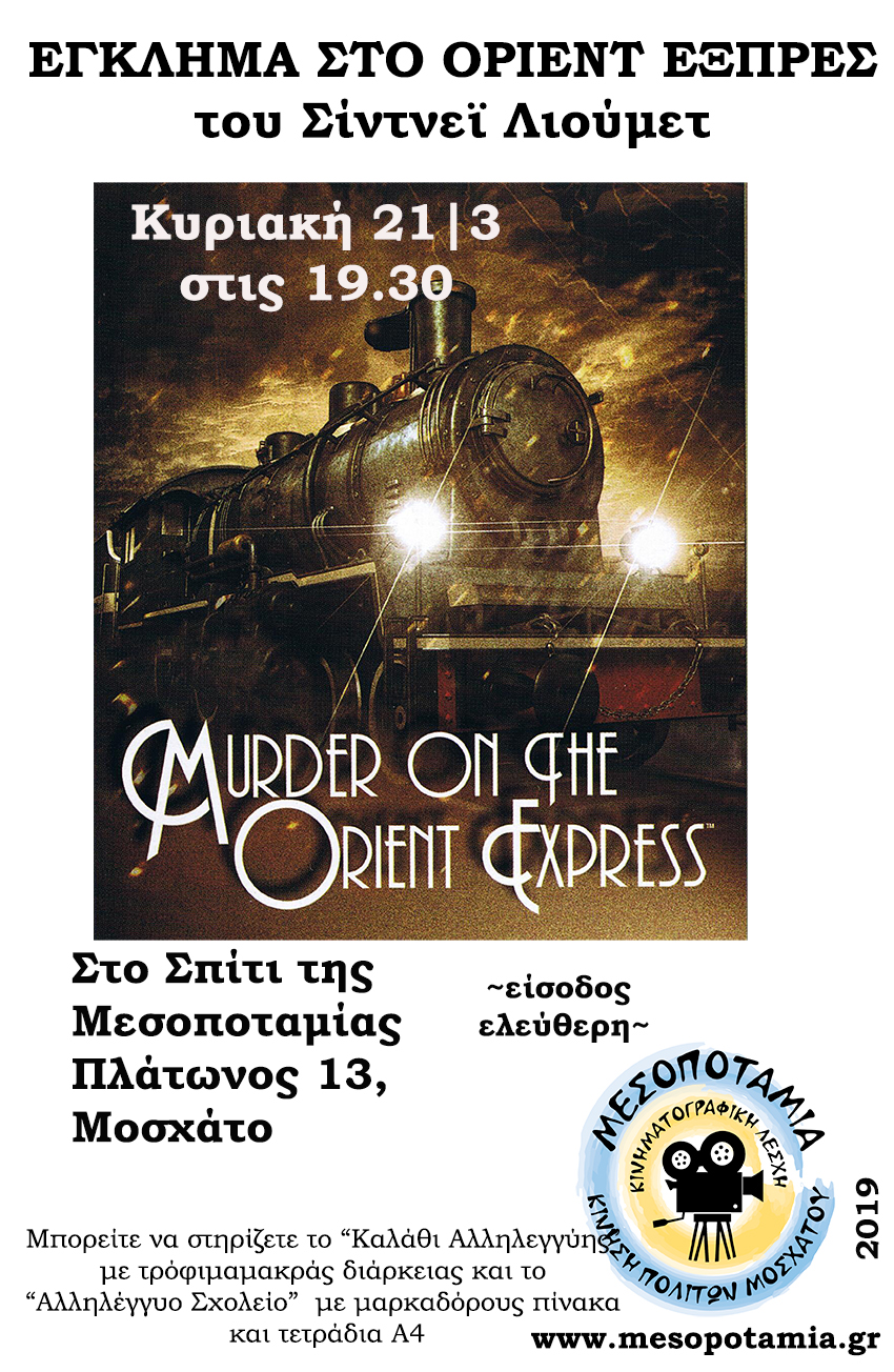 Η επόμενη προβολή μας θα λάβει χώρα αυτή την Κυριακή, 24/3, με την κλασσική ταινία μυστηρίου «Έγκλημα στο Όριεντ Εξπρές» του Σίντνεϊ Λιούμετ (1974, Έγχρωμο, 128΄), με τους Άλμπερτ Φίνεϊ, Σον Κόνερι, Λορίν Μπακόλ, Ίνγκριντ Μπέργκμαν, Ζακλίν Μπισέ, Άντονι Πέρκινς. Η ταινία βασίζεται στο μυθιστόρημα της Άγκαθα Κρίστι.