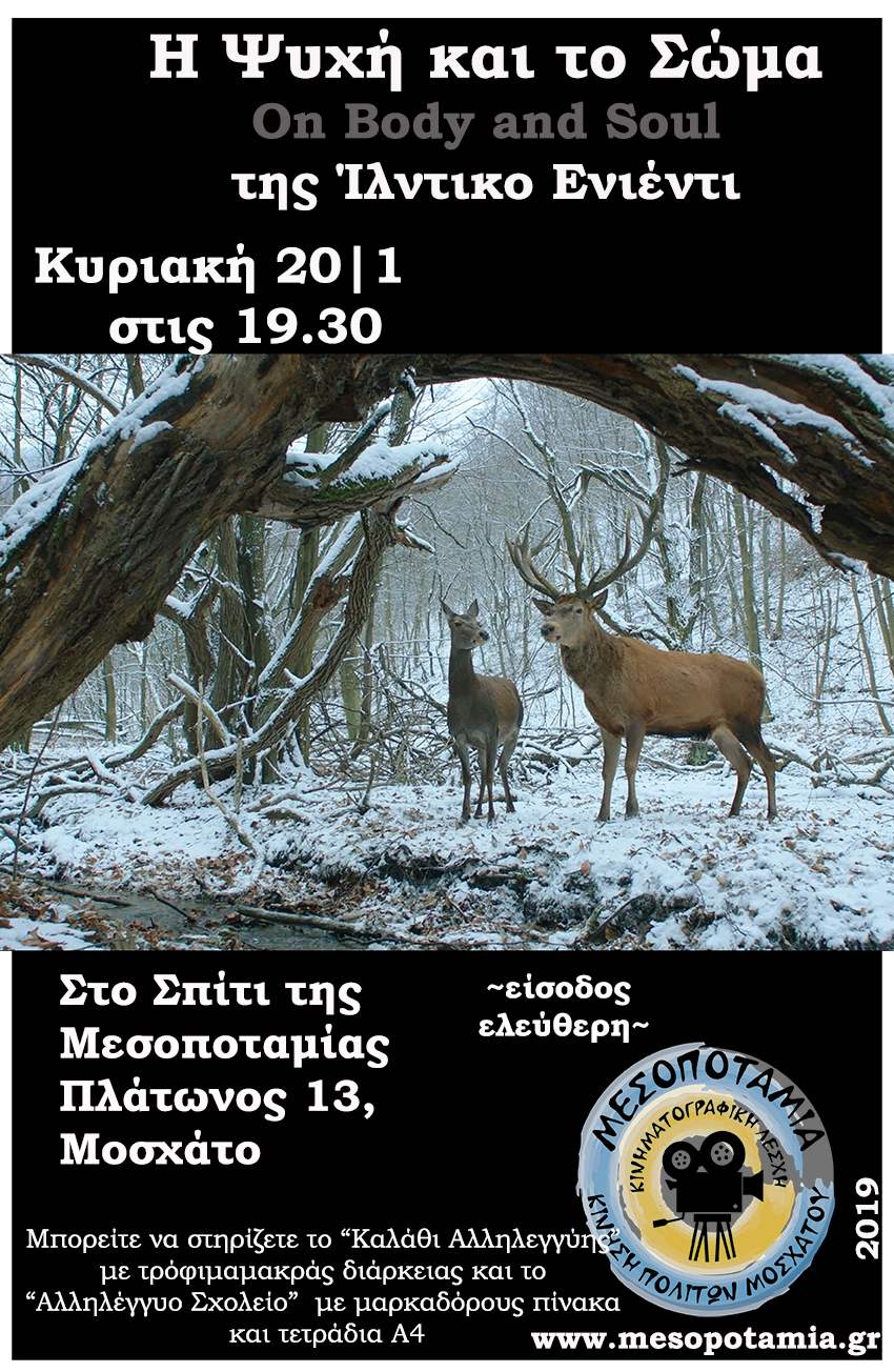Συνεχίζουμε τις προβολές μας αυτή την Κυριακή, 20/1, με τη βραβευμένη με Χρυσή Άρκτο ταινία «Η Ψυχή και το Σώμα» της Ίλντικο Ένιεντι (2017, Έγχρωμο, 116΄), με τους Γκέζα Μορτζάνι και Αλεξάντρα Μπορμπέλι.