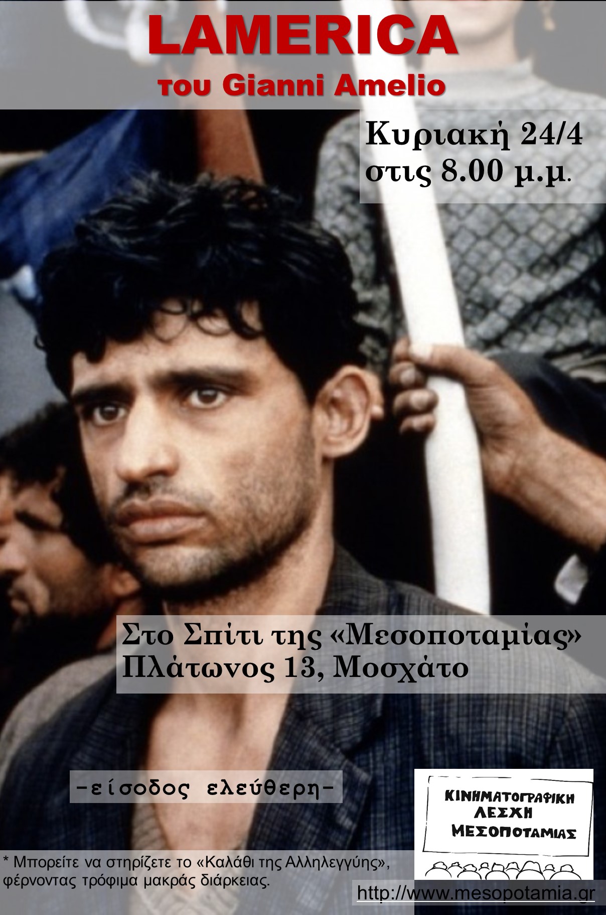 Ολοκληρώνοντας το αφιέρωμα «Αναζητώντας τη Γη της Επαγγελίας«, η Μεσοποταμία προβάλλει αυτή την Κυριακή, 24/4/2016, την ταινία «Lamerica»,(1994) του Gianni Amelio. Η ταινία, που σπάνια προβάλλεται στην Ελλάδα, εκτυλίσσεται στην Αλβανία, λίγο μετά την πτώση του κομμουνιστικού καθεστώτος. Δύο Ιταλοί τυχοδιώκτες εμφανίζονται σαν μεγαλοεπιχειρηματίες, πρόθυμοι να βοηθήσουν στην ανάπτυξη της ντόπιας οικονομίας,στήνοντας ένα εργοστάσιο παπουτσιών, ενώ στην πραγματικότητα επιθυμούν απλώς να «τσεπώσουν» τις επιχορηγήσεις. Στην προσπάθεια να οργανώσουν την εταιρεία τους, βρίσκουν ξεχασμένο σε ένα άσυλο έναν ηλικιωμένο άντρα Αλβανικής καταγωγής, που δείχνει να μην έχει οικογένεια ή φίλους. Σύμφωνα με τα σχέδια των τυχοδιωκτών, ο άνθρωπος αυτός θα εμφανίζεται στα χαρτιά ως ο πρόεδρος της επιχείρησης.