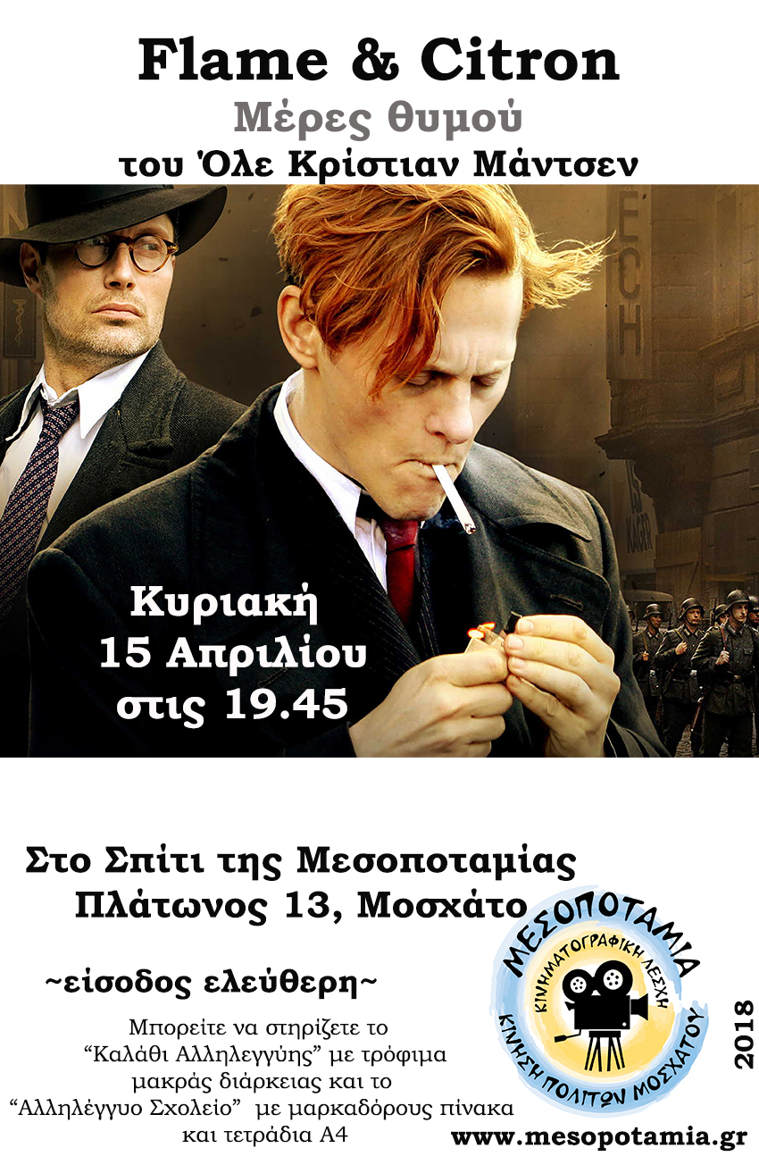 Μετά τις γιορτές, ξαναρχίζουμε τις προβολές μας αυτή την Κυριακή, με την ταινία Flame και Citron (2008, Έγχρωμο, 130΄) του Όλε Κρίστιαν Μάντσεν. Η ταινία είχε παιχτεί στην Ελλάδα και με τον τίτλο «Μέρες Θυμού».