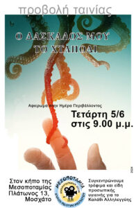 Οι προβολές της Κινηματογραφικής Λέσχης Μεσοποταμίας συνεχίζονται με την ταινία-ντοκιμαντέρ «Ο δάσκαλος μου, το χταπόδι» σε σκηνοθεσία Πίππα Έλριχ και Τζέημς Ρηντ, με τον κινηματογραφιστή Κραιγκ Φόστερ να καταγράφει την σχέση του με ένα χταπόδι.