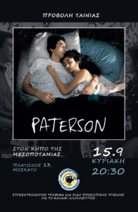 Οι προβολές της Κινηματογραφικής Λέσχης συνεχίζονται την Κυριακή 15/09, στις 20:30, στην αυλή της Μεσοποταμίας, με την ταινία το PATERSON του Τζιμ Τζάρμους.