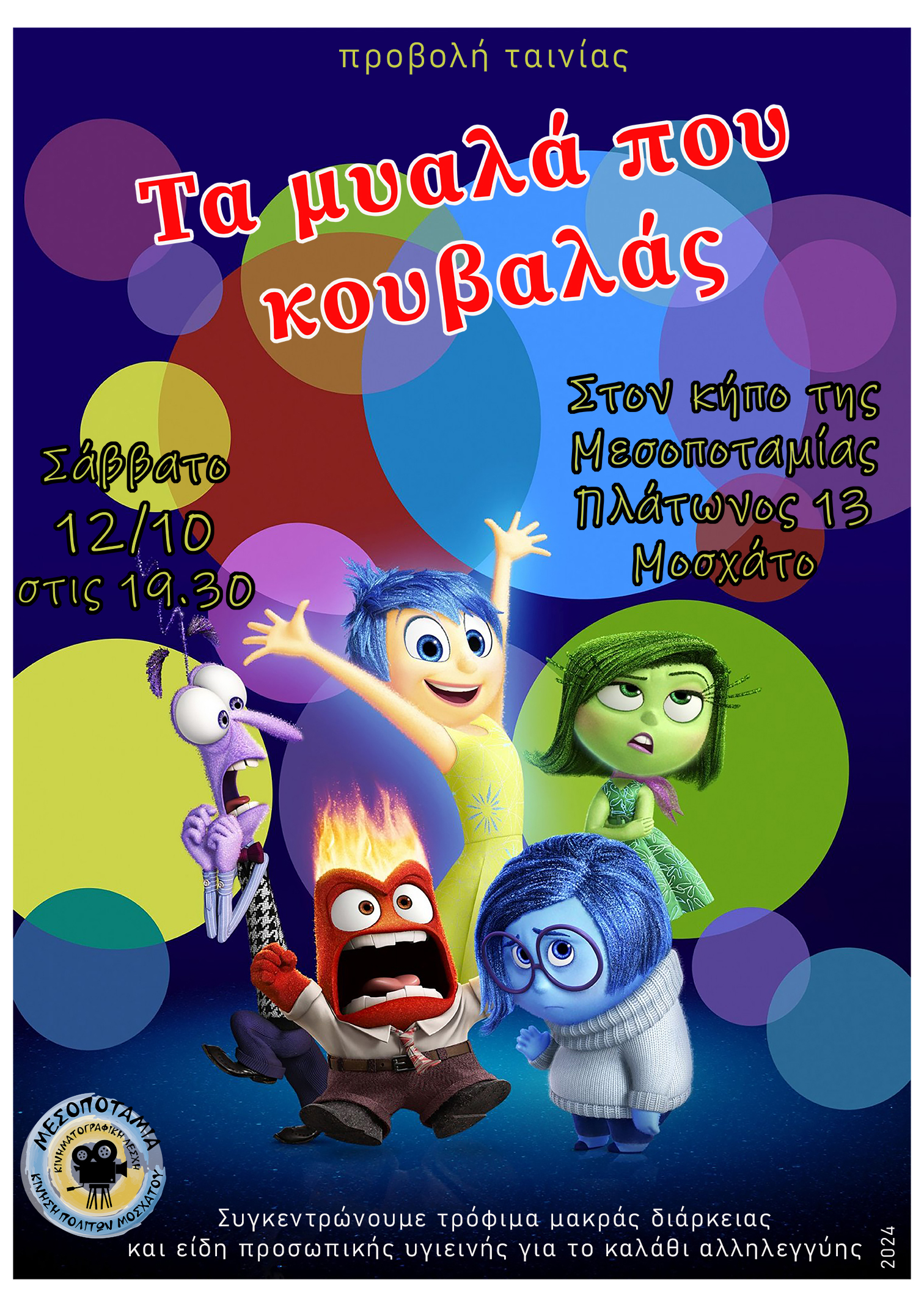Οι προβολές της Κινηματογραφικής Λέσχης Μεσοποταμίας συνεχίζονται το Σάββατο 12/10. Σε συνεργασία με το Σύλλογο Γονέων και Κηδεμόνων του 2ου Δημοτικού σχολείου Μοσχάτου υποδεχόμαστε στην αυλή μας μικρούς σινεφίλους στην προβολή της ταινίας κινουμένων σχεδίων «Τα μυαλά που κουβαλάς» (Inside out) (2015, Εγχ | 95′) την πρώτη ταινία του σίκουελ της Pixar.