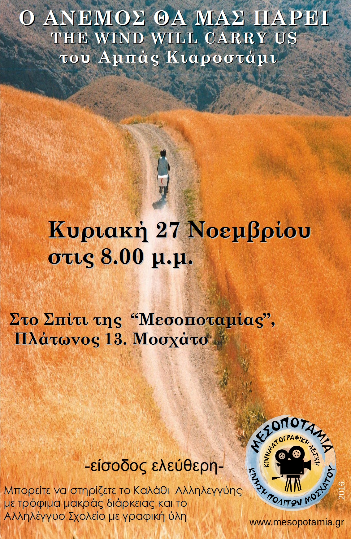 Ολοκληρώνουμε τις προβολές μας για το μήνα Νοέμβριο με την ταινία «Ο Άνεμος θα μας πάρει» του Αμπάς Κιαροστάμι. Αυτή την Κυριακή, 27/11, στις οκτώ το βράδυ.
