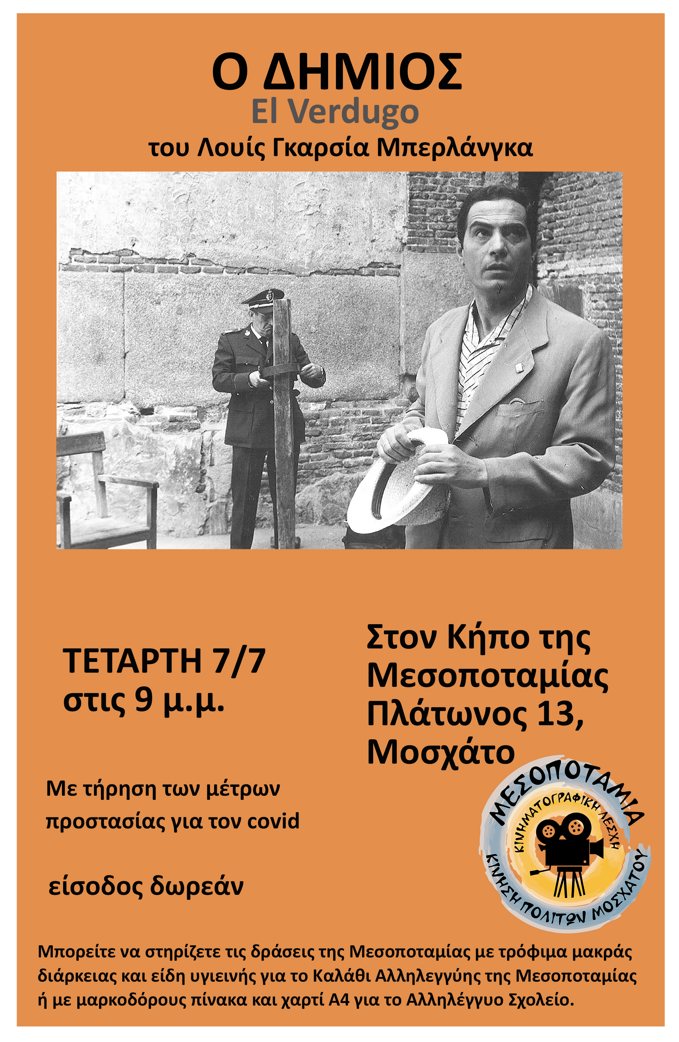 Η τρίτη θερινή προβολή στη Μεσοποταμία είναι η ισπανική ταινία «Ο Δήμιος», του Λουίς Γκαρθία Μπερλάνγκα, με τους: Nino Manfredi, Emma Penella, José Isbert.