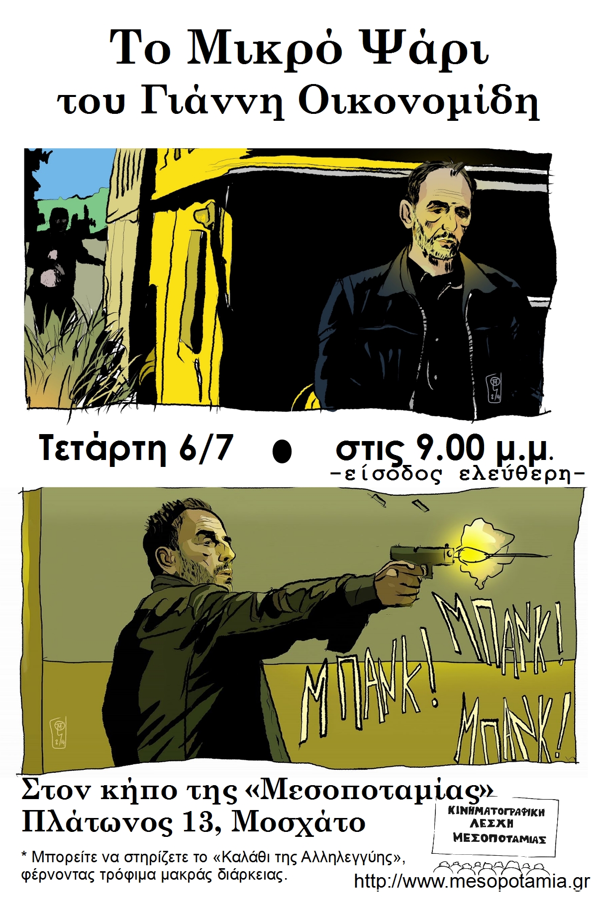 Η πρώτη προβολή της Κινηματογραφικής Λέσχης Μεσοποταμίας για το μήνα Ιούλιο είναι το φιλμ «Το Μικρό Ψάρι» (2014) του Γιάννη Οικονομίδη. Με συμμετοχές σε διεθνή φεστιβάλ, με ένα εντυπωσιακό καστ και με κινηματογράφηση υψηλού επιπέδου, το Μικρό Ψάρι είναι μια από τις σημαντικότερες ελληνικές ταινίες των τελευταίων ετών και για πολλούς η ωριμότερη ίσως σκηνοθετική στιγμή ενός από τους σημαντικότερους δημιουργούς της γενιάς του.