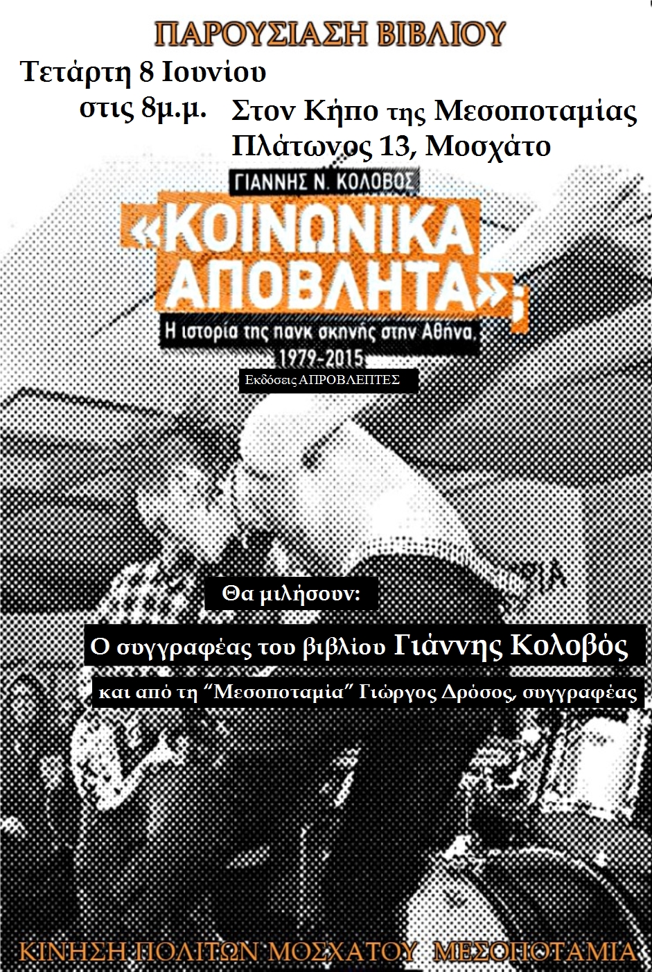 H Κίνηση Πολιτών Μοσχατου Μεσοποταμία και οι Εκδόσεις Απρόβλεπτες παρουσιάζουν αυτή την Τετάρτη 8 Ιουνίου, στις 8μ.μ., το βιβλίο του Γιαννη Ν. Κολοβου «Κοινωνικά Απόβλητα;».