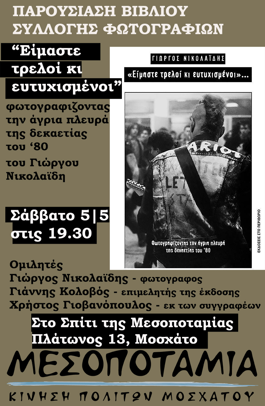 Η κίνηση πολιτών Μοσχάτου «Μεσοποταμία» διοργανώνει παρουσίαση του βιβλίου- συλλογής φωτογραφιών «Είμαστε τρελλοί κι ευτυχισμένοι: Φωτογραφίζοντας την άγρια πλευρά της δεκαετίας του ’80» του Γιώργου Νικολαϊδη, το Σάββατο 5/5 στις 19.30, στο Σπίτι της Μεσοποταμίας, Πλάτωνος 13, Μοσχάτο.