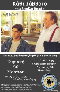 Cinema Club will conclude it’s events for March on Sunday, 26th of March by projecting the Greek film “Every Saturday (Kathe Savvato)” by Vasilis Vafeas. You are welcome at Mesopotamia’s garden, […]