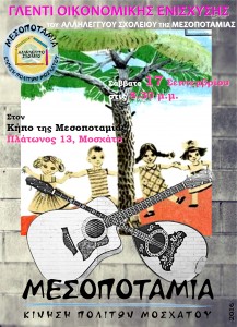 Fund raising Event for Mesopotamia’s Solidarity School 12/09/2016 We celebrate the start of the fourth year of Mesopotamia’s Solidarity School on Saturday 17th of September, at 20:30 at the Garden of our house (Platonos 13, Mosxhato)! We will […]