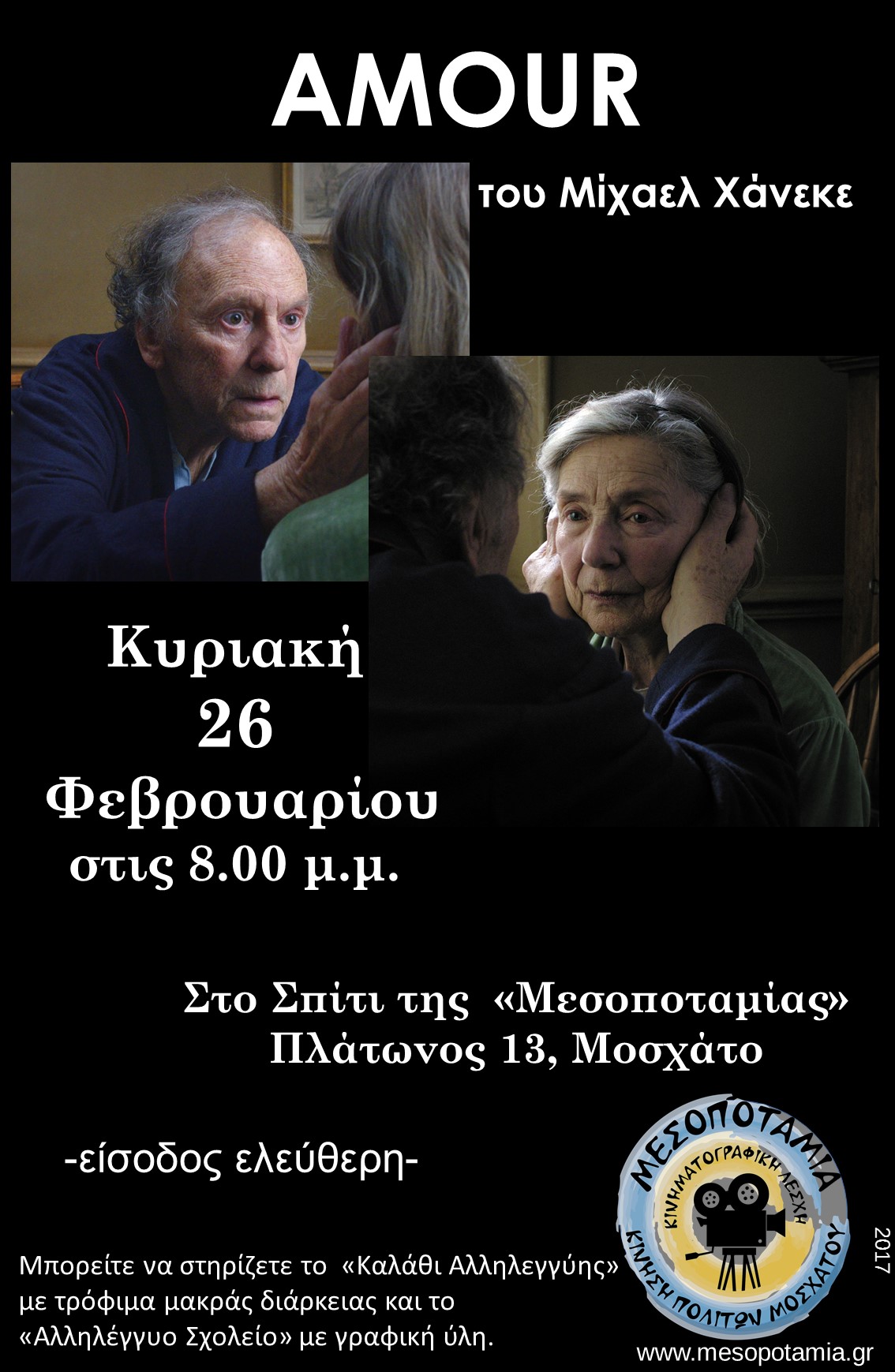Cinema Club will conclude it’s events for February on Sunday, 26th of February by projecting the film “Amour” by Mikhael Haneke.