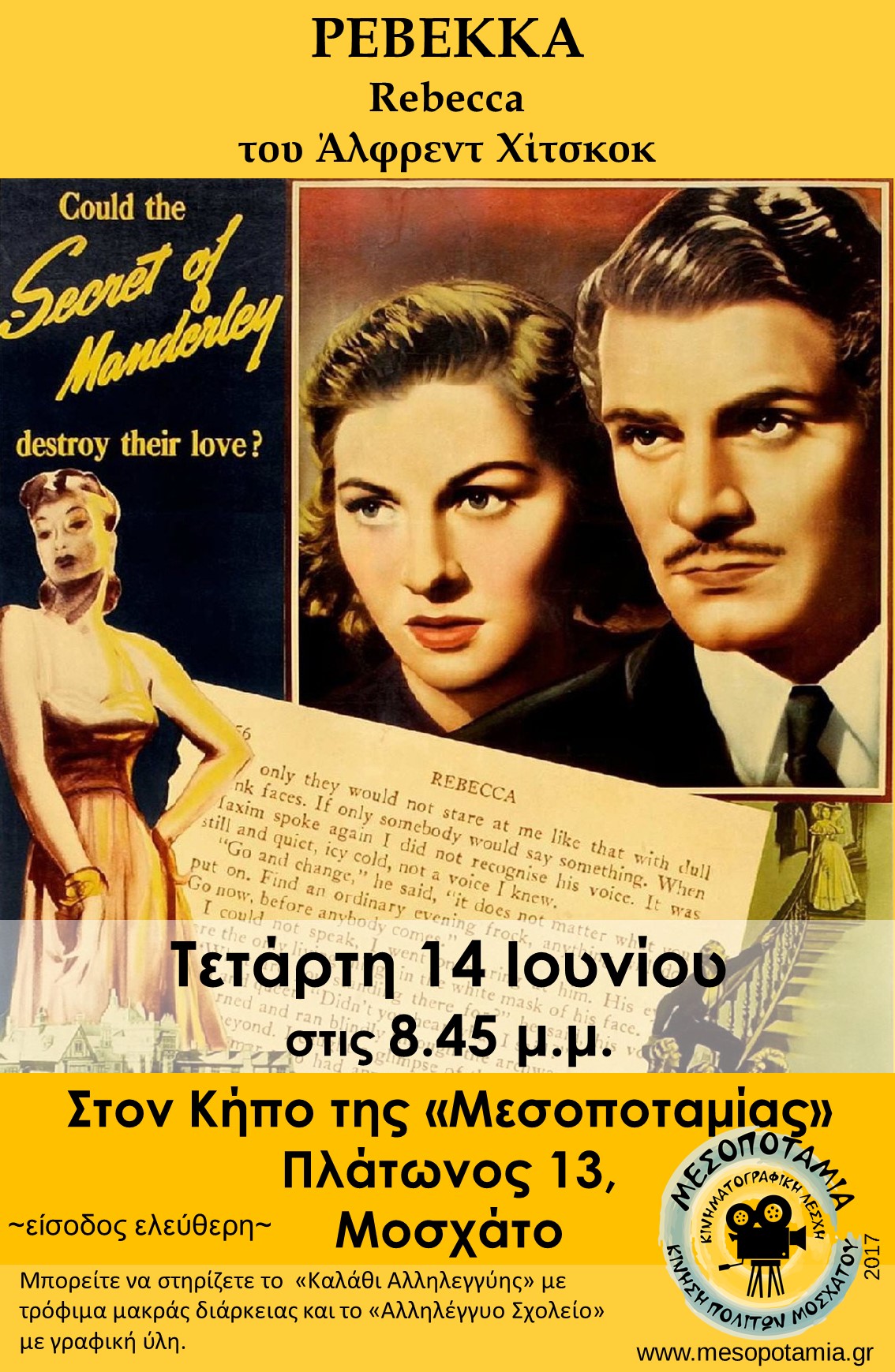 Cinema Club will continue its projections this Wednesday, 14th of June by projecting the English classic film “Rebecca” by Alfred Hitchcock.