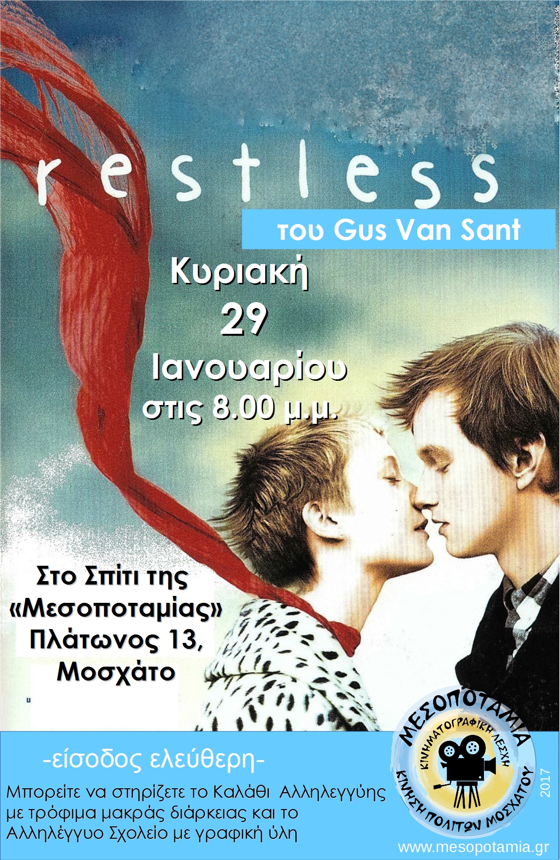 Cinema Club will conclude it’s events for January on Sunday, 29th of January by projecting the film “Restless” by Gus Van Sant.
